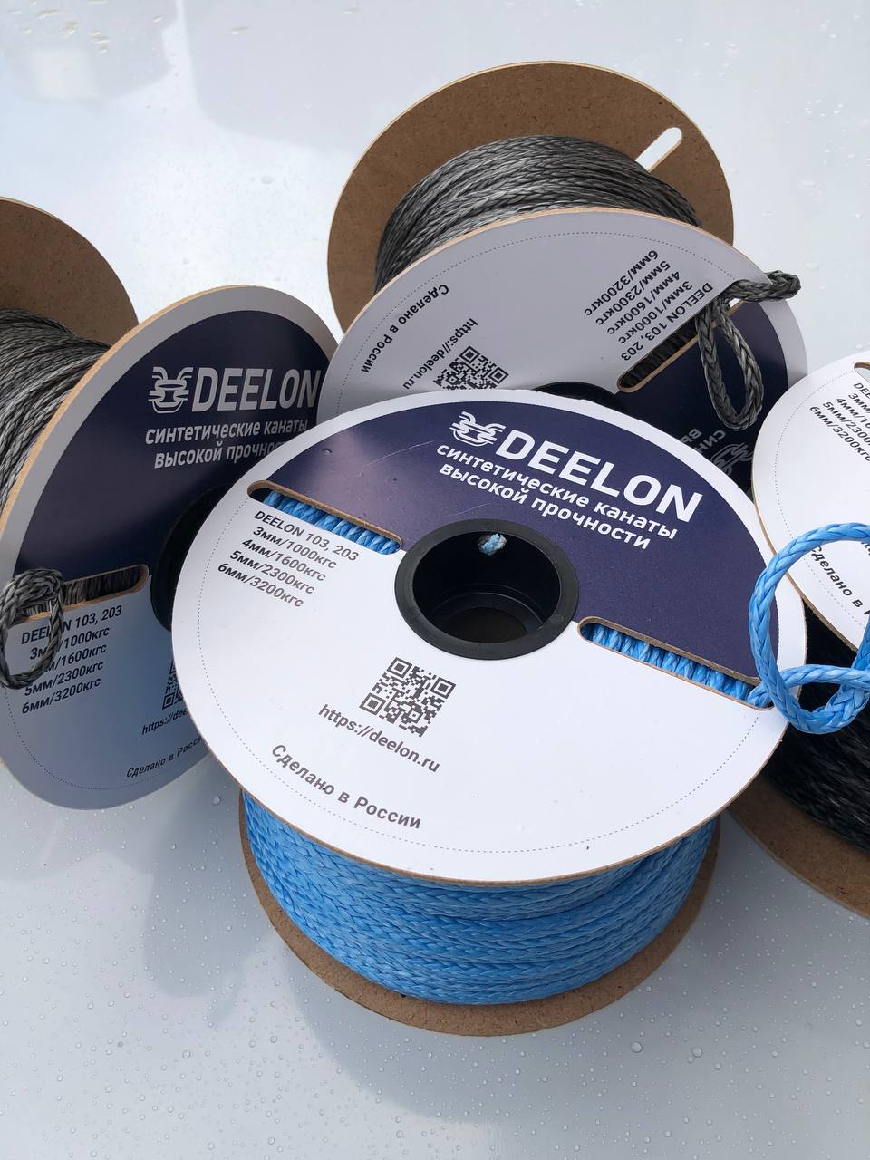 Имеет осмысленное артикульное обозначение для заказа. Например, DN103-05-GR-100 — канат DEELON 103, диаметр 3мм, цвет GR - серый, намотка на катушке 100 метров.